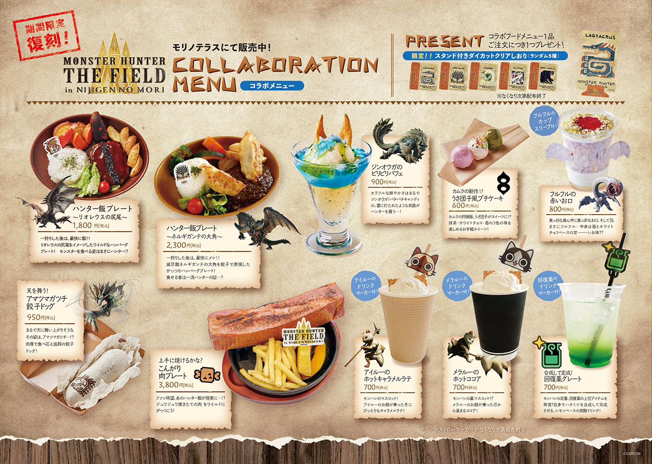 各メニューは、なくなり次第完売となります!冬休みに復活したハンター体験アトラクション「モンスターハンター・ザ・フィールド」と一緒に、今だけの限定コラボメニューをお召し上がりくださいね!