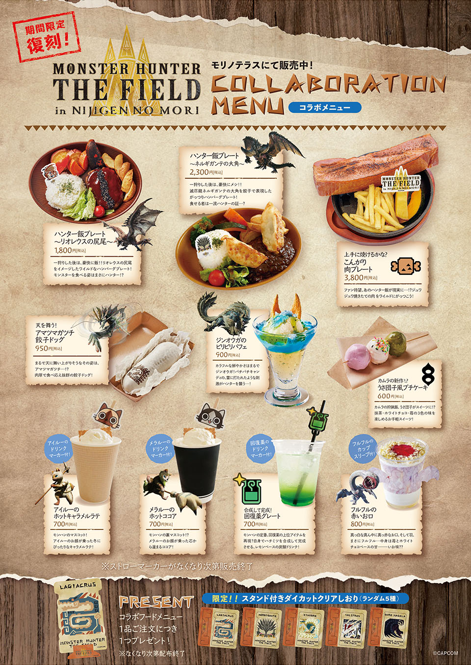 各メニューは、なくなり次第完売となります!冬休みに復活したハンター体験アトラクション「モンスターハンター・ザ・フィールド」と一緒に、今だけの限定コラボメニューをお召し上がりくださいね!
