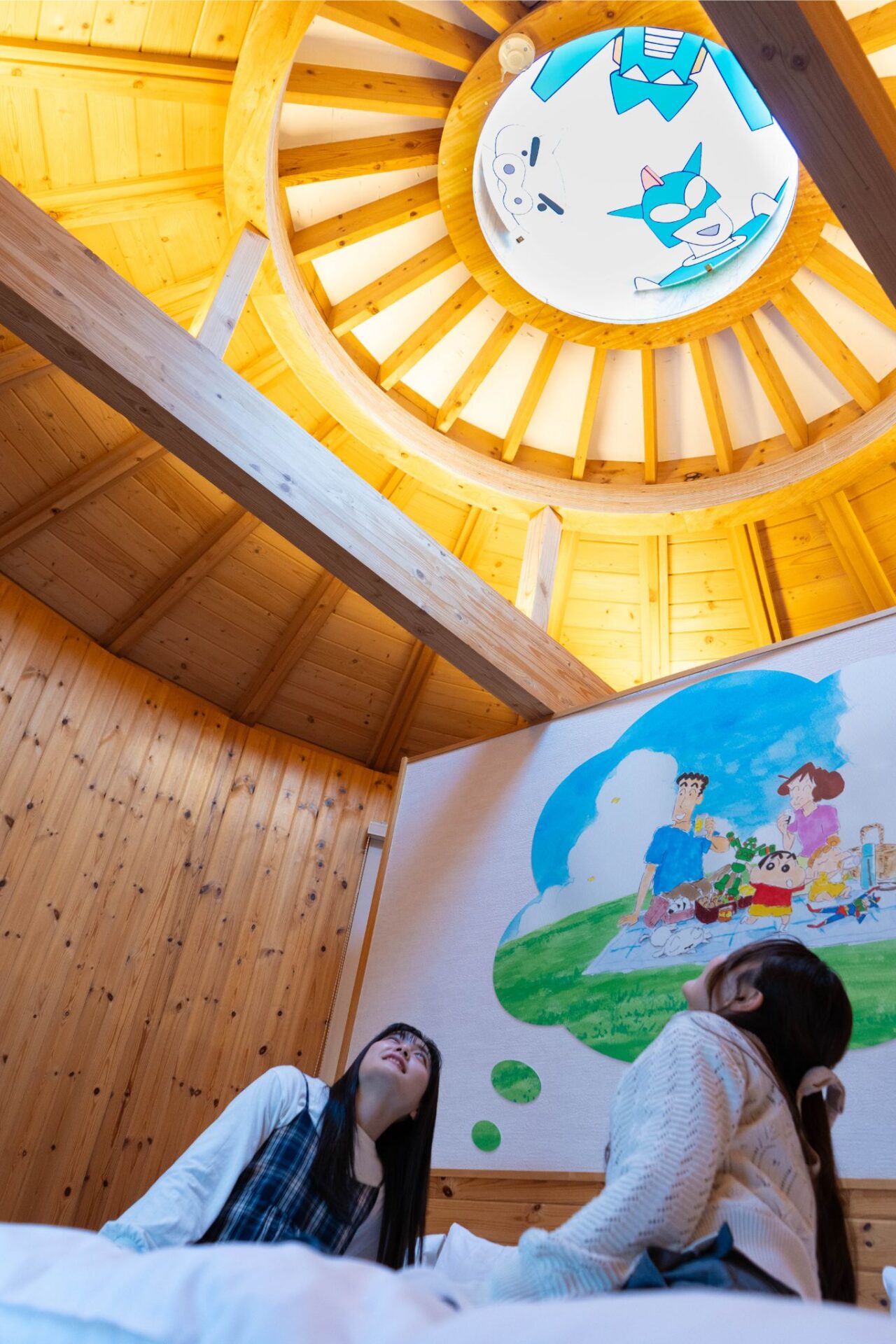 本ルームでは、登場キャラクターである“しんのすけ”や“ひまわり”が高さ5mの天窓からお部屋を覗く様子や、大きなシロのラグマットに、隠れぶりぶりざえもんの装飾などが施されており、遊び心があふれた仕掛けが盛りだくさんです。ご宿泊者様は、「クレヨンしんちゃん」の作品の世界観を存分に楽しむことができます。