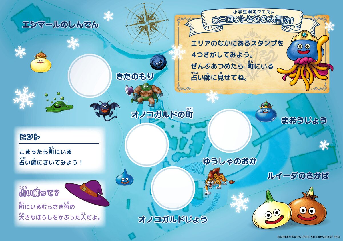 本クエストは、アトラクションエリア内に隠された冬限定モンスターのスタンプを探しながら、エリアを巡るスタンプラリー形式のクエストです。大冒険キャンペーン期間中は、ゴールドチケット以上をご購入の方を対象にこれまで小学生限定で開催していた本クエストに、大人の方も参加することが可能となります。また、対象年齢関わらずクエストをクリアされた方には、ホミロットや玉ねぎスライムがデザインされた、ドラゴンクエスト アイランド限定のオリジナルステッカーをお渡しいたします。