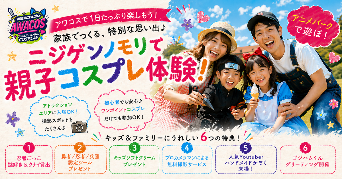 本イベントは、コスプレイベントとしての魅力に加え、ご家族・ご友人・カップルなど春の淡路島観光・週末レジャーの一環としても楽しめる特別なプログラムデーです。神戸・大阪方面からもアクセスしやすい立地にあり、明石海峡大橋を渡ってすぐという好アクセスも魅力のひとつ。日帰りでも気軽に訪れることができ、春休みやちょっとしたお出かけにも。観光とあわせて楽しめます。ぜひこの機会に、コスプレと二次元コンテンツが融合した特別な一日を過ごしに、ニジゲンノモリへ遊びに来てみてはいかがでしょうか。