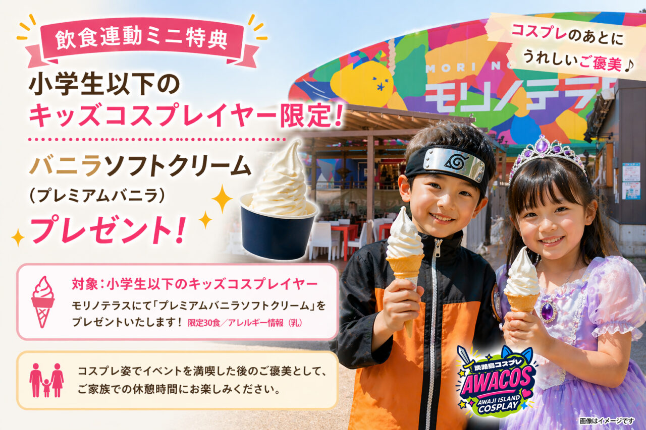 小学生以下のキッズコスプレイヤーを対象に、モリノテラスにてバニラソフトクリーム(プレミアムバニラ)をプレゼントいたします。コスプレ姿でイベントを満喫した後のご褒美として、ご家族での休憩時間にお楽しみください。