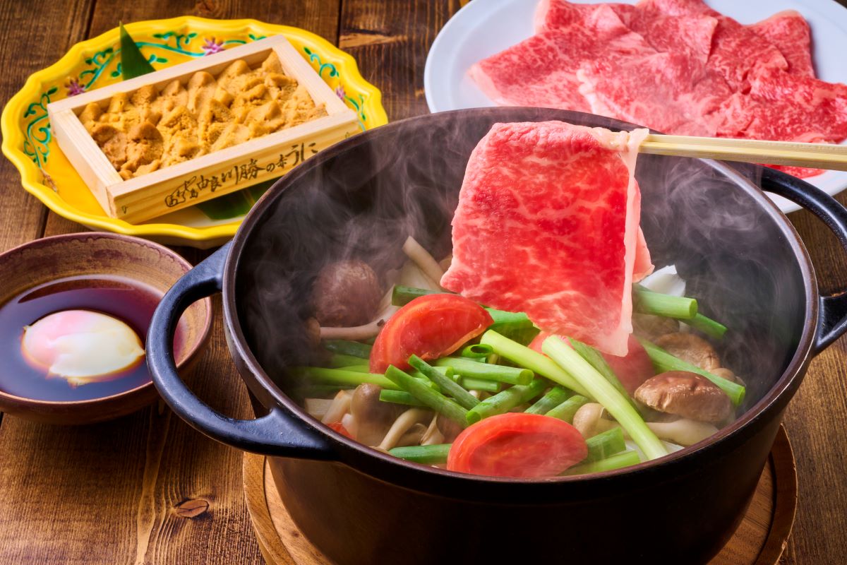 食材は、淡路島の年間200頭ほどしか取れない淡路ビーフ、新鮮さゆえ提供ができる「逆さうに(由良産のうに)、淡路島産の玉ねぎ、トマトをなどたっぷりの野菜を使ったすき焼きをはじめ、季節によりお好みのメニューお選びいただけます。※食材は時期により異なる場合がございます。
