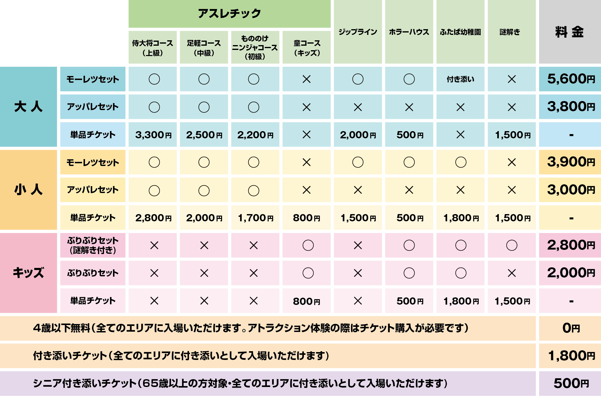 大人(12歳以上) | 5,600円~6,400円 | (1)アスレチック (2)ジップライン (3)オラのハチャメチャ!ぶりぶりハウス (4)ふたば幼稚園(付き添い) (5)アクション仮面ひみつきち(付き添い) |