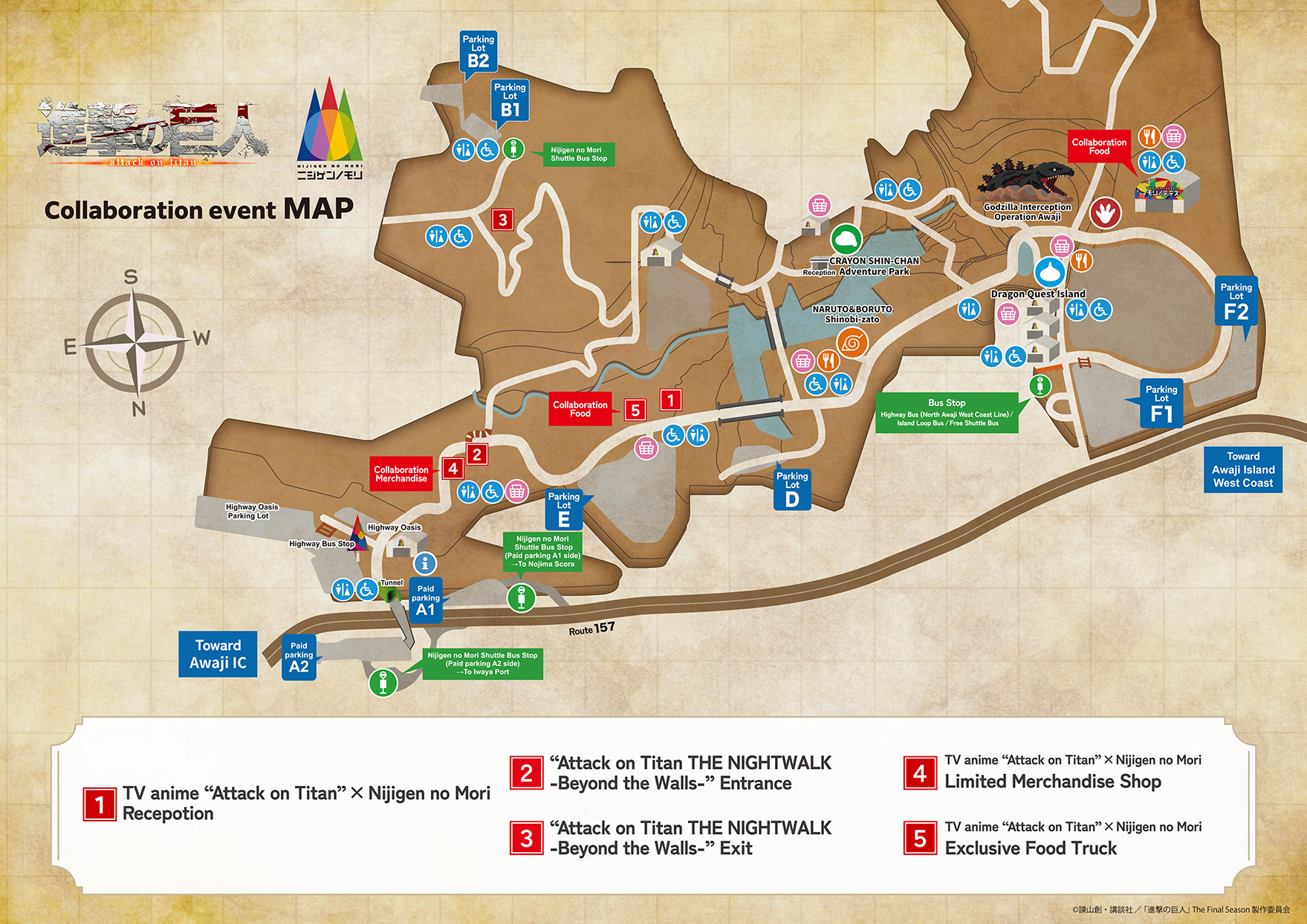 자가용으로 오시는 분들은 아와지시마 현립공원 E 주차장이 TV 애니메이션 ‘진격의 거인’과 니지겐노모리 콜라보레이션 이벤트 리셉션에서 가장 가까운 주차장입니다.