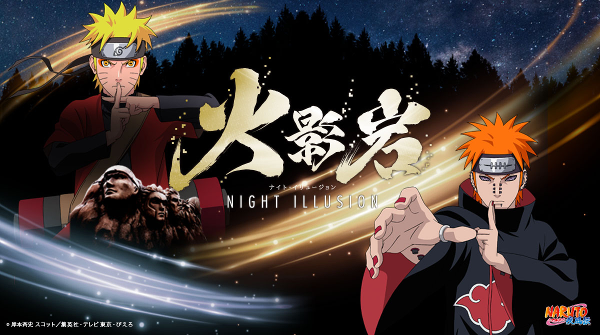 巨大な火影岩がダイナミックに輝く、夜間限定プロジェクションマッピングショー。